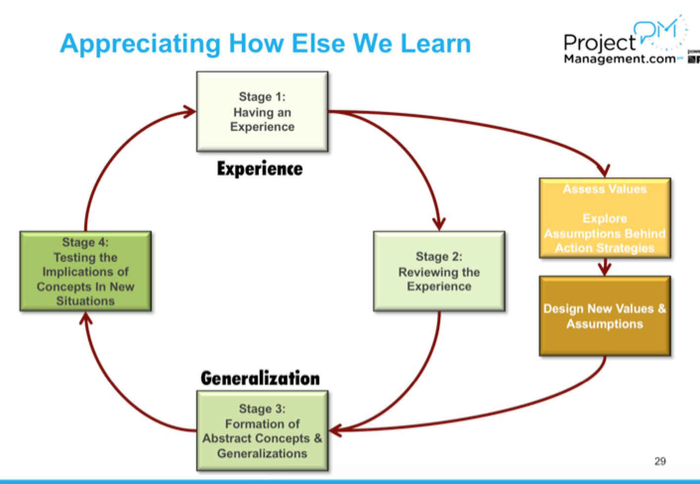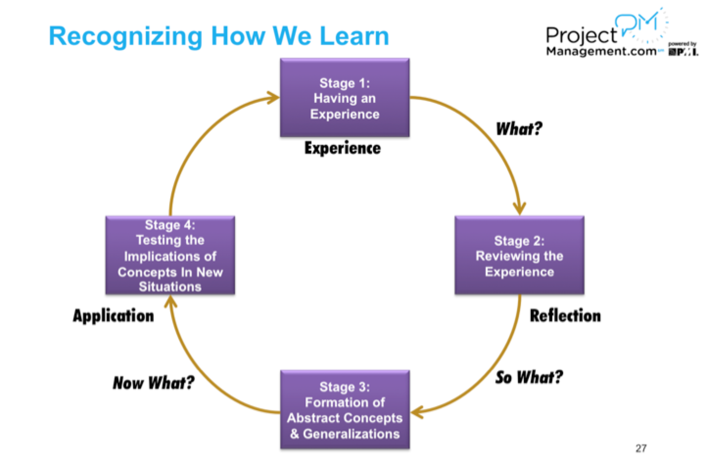 - Certified project management professionals learn by doing, start with experience, commit to trying to learn from and build on the experience (refer to slide 2- experience to reflection to conceptualizations to generalizations to application, and then to more experiences)